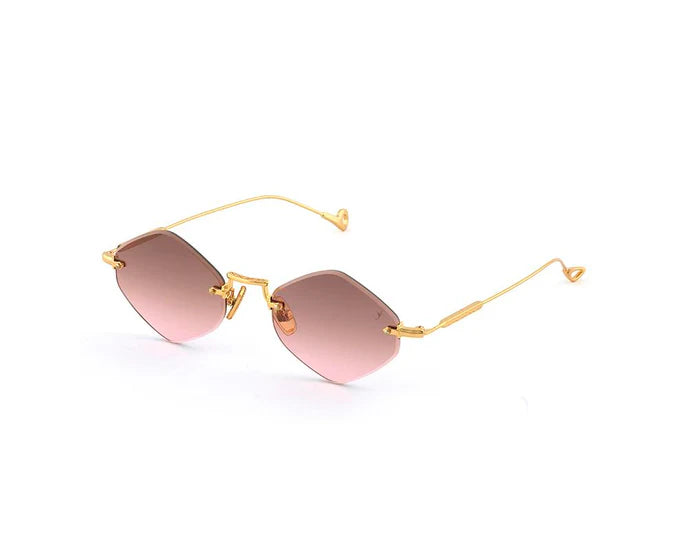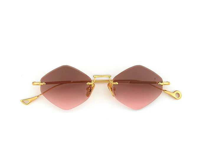 - Lenses: Rimless lenses with a distinctive rhomboid (diamond) shape. They have a pink-to-brown gradient tint.