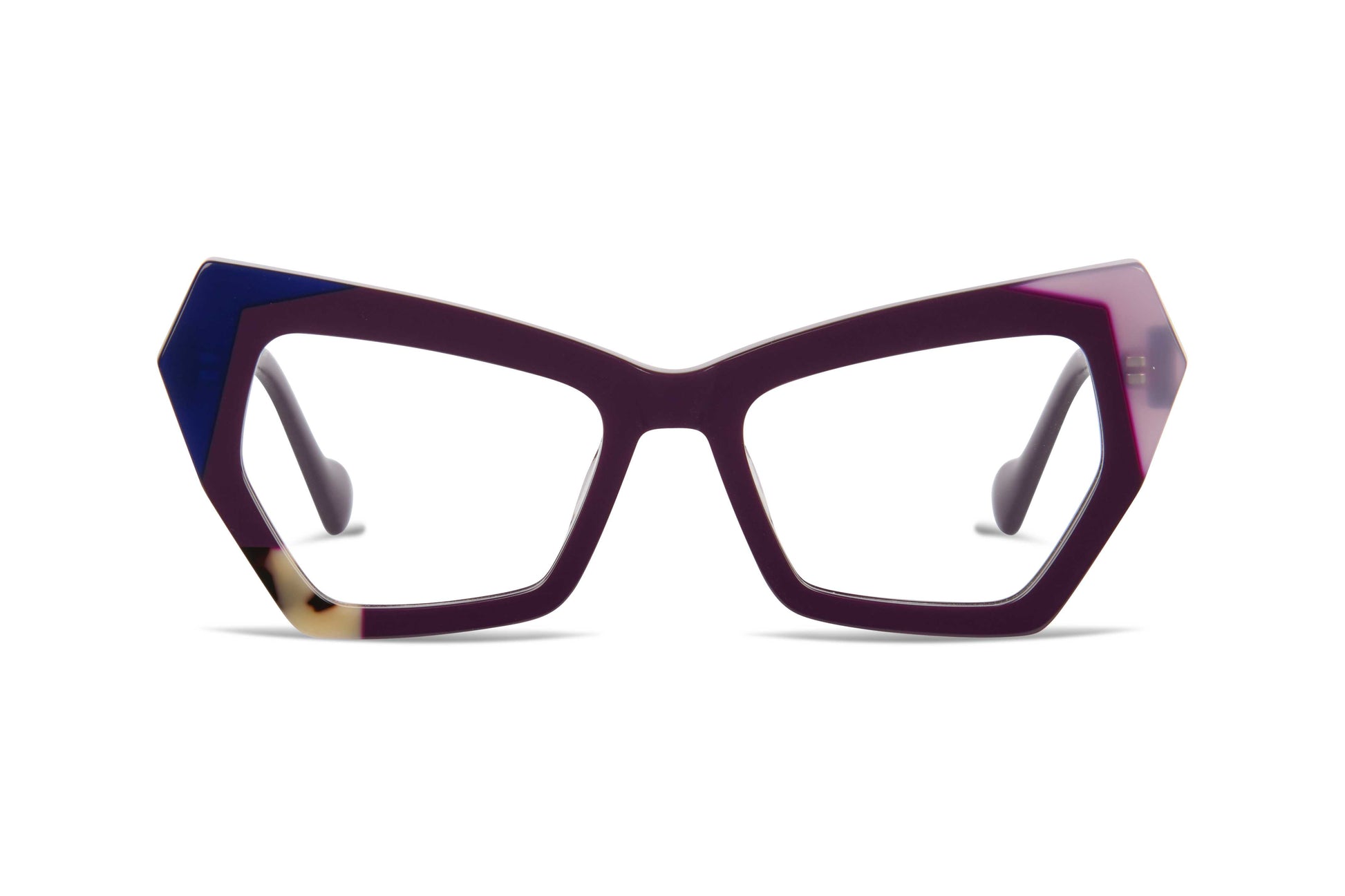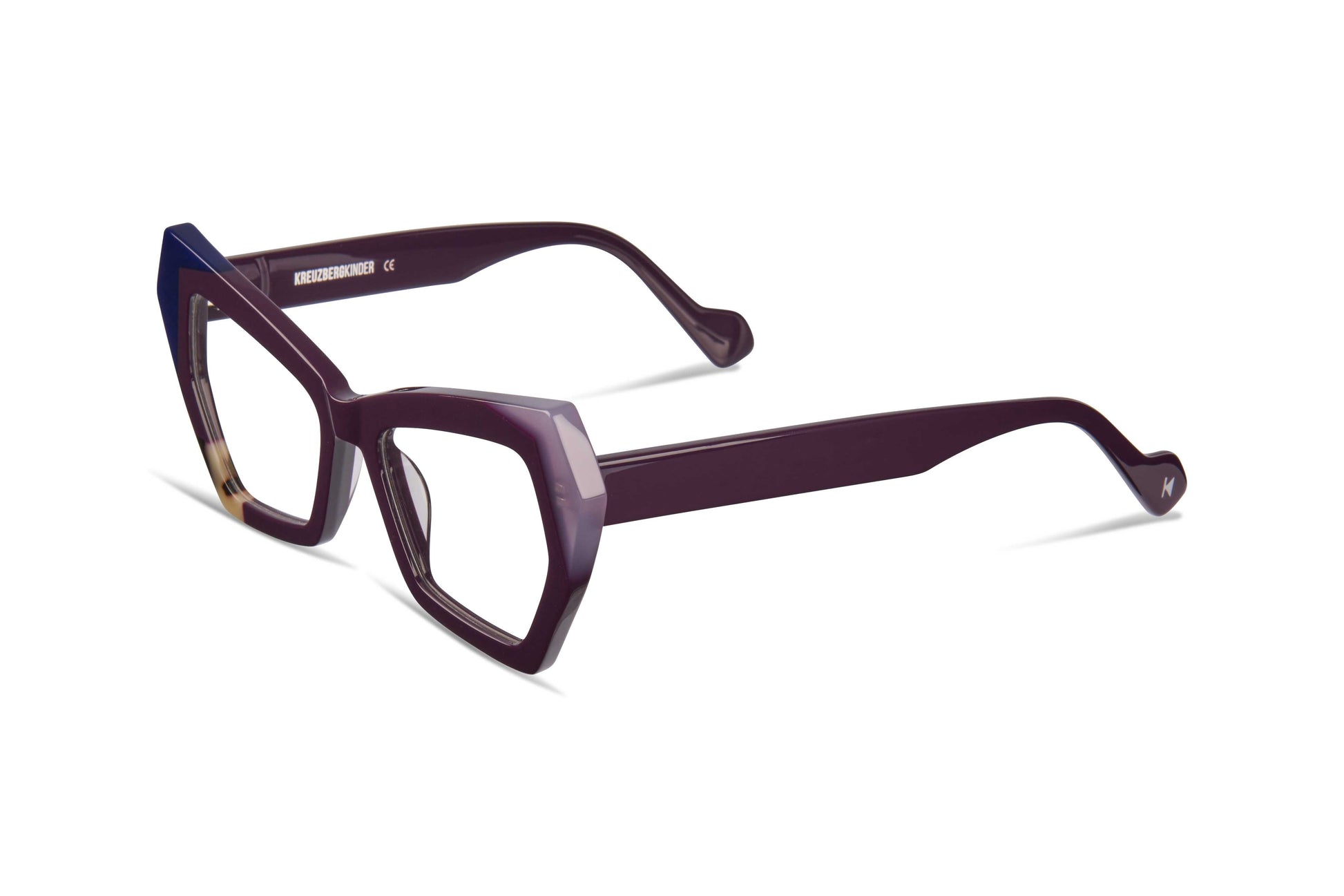 Gli occhiali da vista "Leila" di Kreuzbergkinder sono caratterizzati da un design audace e asimmetrico, che cattura lo spirito irriverente del marchio. La montatura è realizzata interamente in acetato e presenta una forma a "occhio di gatto" stilizzata e geometrica.