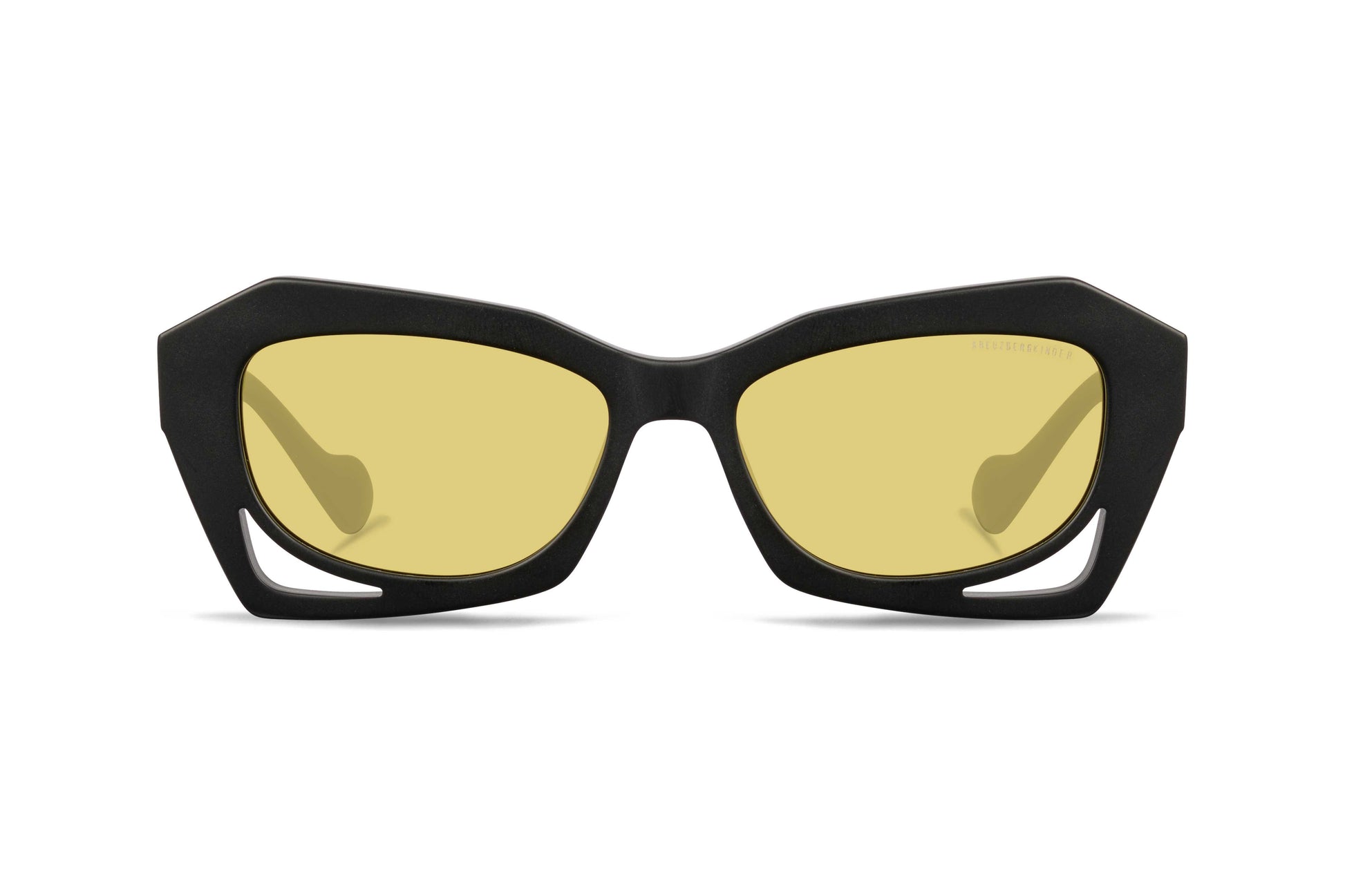 Esprimi la tua individualità con questi esclusivi occhiali da sole Kreuzbergkinder. La montatura, realizzata in robusto acetato nero, presenta un audace e moderno design "cat-eye" angolare, perfetto per chi non ha paura di farsi notare. Le lenti color giallo aggiungono un tocco di stile contemporaneo, migliorando la percezione dei contrasti in condizioni di scarsa luminosità e garantendo al contempo una protezione completa dai raggi UV.
