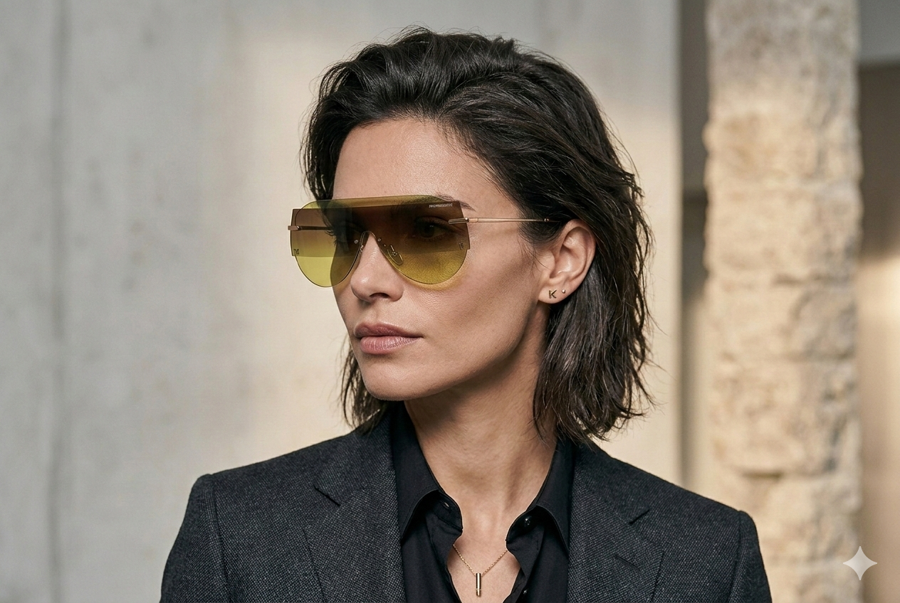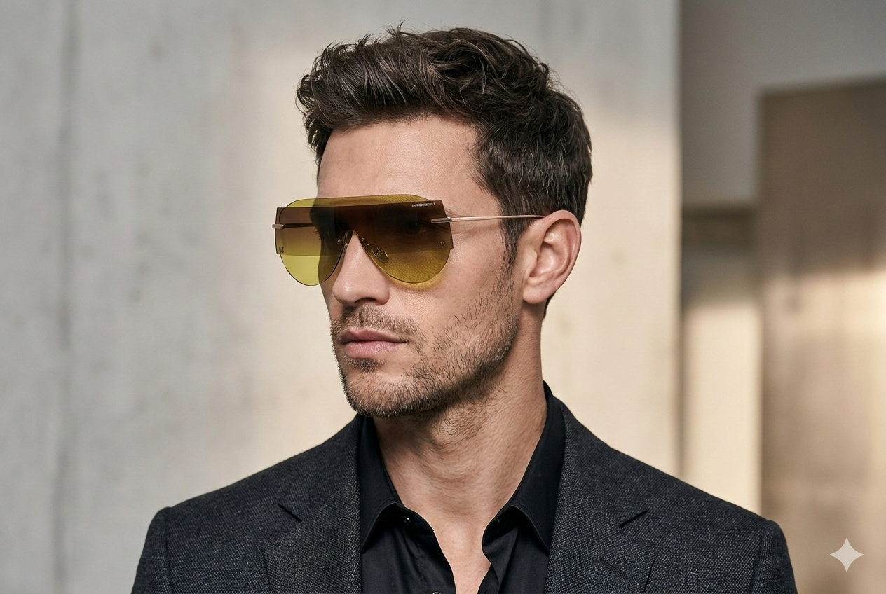 - Design a Mascherina: Il modello ORAZIO si distingue per la sua forma a mascherina, una lente singola che copre la parte superiore del viso per un effetto futuristico e audace.